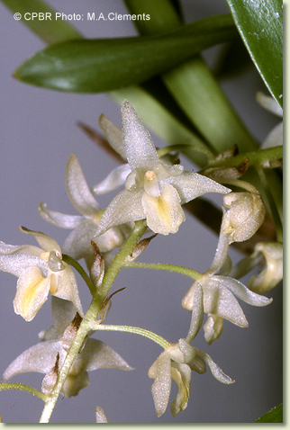 Occurs in rainforest margins, open forests and woodlands in humid conditions, growing on rocks and tree trunks and on the branches of trees along stream banks. It is often found growing on the roughened surface of Pandanus species. Its flowers are fragrant.