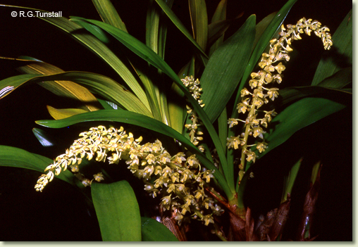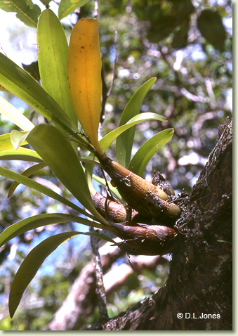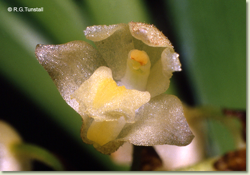 Epiphytic or lithophytic herb forming dense, medium-sized to large clumps. Pseudobulbs crowded, ovoid, 15-20 cm x 3-4 cm, fleshy, sheathed with brown papery bracts. Leaves 3-4 per pseudobulb, erect to arching, apical, distichous, shortly petiolate, bases sheathing pseudobulb; lamina obovate, 20-30 cm x 4-5 cm, dark green, thin-textured, stiff, apex obtuse to acute. Inflorescence an axillary raceme, erect to pendulous, 150-300 mm long, from upper nodes of pseudobulb; pedicels 10 mm long, including ovary. Flowers 5-35, resupinate, porrect to nodding, opening widely, 12-15 mm x 12-15 mm, translucent-cream to creamy yellow. Sepals and petals briefly widely spreading, becoming cupped before closing, thin-textured, externally pubescent. Dorsal sepal incurved, ovate to obovate, 6-8 mm x 3 mm. Lateral sepals spreading widely, triangular, falcate, 6-8 mm x 4 mm, bases fused to column foot. Petals obliquely erect, 5-7 mm x 2.5 mm. Labellum 6-8 mm x 4-5 mm, entire or 3-lobed; lateral lobes crescent-shaped; midlobe short, apex truncate, with 3 parallel ridges. Column 3 mm long. Column foot 4.5 mm, almost at right-angles to column. Capsules erect, dehiscent.
