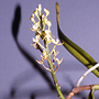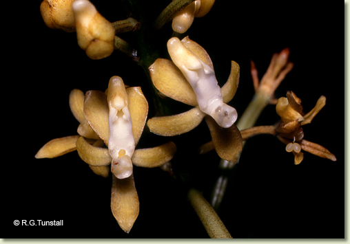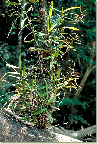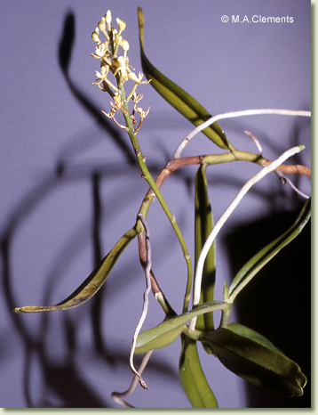 Epiphytic or lithophytic herb forming large straggling clumps. Stems erect or semi-pendulous, 30-120 cm long, sparsely branched, wiry, lower half usually leafless. Leaves 5-20, scattered along upper half of stem, widely spaced, prostrate, distichous, sessile, bases sheathing stem; lamina oblong, 8-15 cm x 2-3 cm, often yellowish green, stiff, leathery, apex unequally emarginate. Inflorescence an axillary raceme, erect, 150-250 mm long, emerging opposite a leaf, slender, stiff. Flowers 10-20, non-resupinate, erect to porrect, 27-30 mm x 12-15 mm, cream, darker with age, fragrant, lasting 5-7 days. Sepals and petals flat, spreading. Dorsal sepal stiffly erect, narrowly obovate, 9 mm x 3 mm. Lateral sepals reflexed behind labellum, smaller than dorsal sepal, oblong, 7 mm x 3.5 mm, bases fused to underside of labellum and column foot. Petals spreading widely, narrowly oblong, c. 7 mm x 2.5 mm. Labellum erect, 9 mm x 2.5 mm, 3-lobed; lateral lobes erect or incurved, triangular, 2 mm x 4 mm, joined to base of column; midlobe curved, 3 mm long, apex acuminate; with deeply saccate spur. Column porrect from end of ovary, 4 mm long. Column foot absent. Capsules porrect, dehiscent.