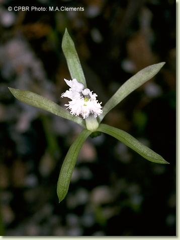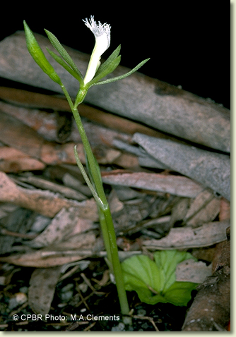 Terrestrial herb forming clonal colonies. Sterile plants a solitary leaf only. Fertile plants initially a terminal inflorescence, a single leaf arising later from base of scape. Tubers solitary, fleshy, rounded, 1 cm wide. Leaf solitary, apical, prostrate, held above ground, orbicular, 4-7 cm wide, dark green, smooth, with 10 radiating veins, margins sinuate, apex obtuse. Inflorescence a terminal raceme, 40-80 mm tall, fleshy; peduncle elongating in fruit. Flower solitary, resupinate, erect, star-shaped, 25-30 mm x 30-35 mm, green with white labellum. Sepals and petals spreading widely, narrowly lanceolate. Dorsal sepal erect, 16-19 mm x 2-2.5 mm. Lateral sepals free, divergent, deflexed, 16-19 mm x 2 mm. Petals falcate, 14-17 mm x 2-2.5 mm. Labellum 15-18 mm x 9-12.5 mm, 3-lobed; lateral lobes erect; midlobe deeply fringed with 3 hairy ridges breaking up into small irregular hairy calli. Column 13 mm long, wider towards the tip. Column foot absent. Capsules pendulous, dehiscent.