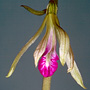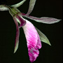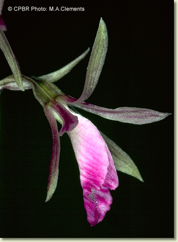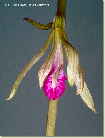Terrestrial herb forming clonal colonies. Sterile plants a solitary leaf only. Fertile plants initially a terminal inflorescence, a single leaf arising later from base of scape. Tubers solitary, fleshy, rounded, 1.2-3 cm wide. Leaf solitary, stiffly erect, apical, petioles 3-5 cm long; lamina broadly ovate, 15-20 cm x 5-7 cm, dark green, pleated with 7 prominent veins, apex acute to acuminate. Inflorescence a terminal raceme, 150-250 mm tall, fleshy; peduncle elongating in fruit. Flowers 1-6, resupinate, porrect to nodding, star-shaped, opening narrowly to widely, 20-30 mm x 20-30 mm, pink, cream or greenish with pink to mauve labellum. Sepals and petals linear to narrowly obovate. Dorsal sepal erect or incurved, 20-25 mm x 3-3.5 mm. Lateral sepals divergent, 20-25 mm x 3-3.5 mm. Petals spreading, 19-23 mm x 3-3.5 mm. Labellum 18-24 mm x 10-14 mm, 3-lobed; lateral lobes incurved to enclose column; midlobe with a filigree of darker hairy veins, undulate margins and 3 narrow hairy ridges. Column 10-12 mm long, wider towards the tip. Column foot absent. Capsules pendulous, dehiscent.