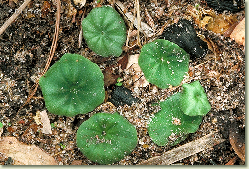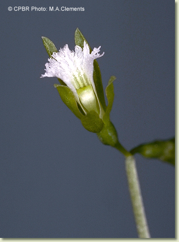 Terrestrial herb forming clonal colonies. Sterile plants a solitary leaf only. Fertile plants initially a terminal inflorescence, a single leaf arising later from base of scape. Tubers solitary, fleshy, ovoid, 1-2 cm wide. Leaf solitary, apical, prostrate, ground-hugging, peltate, 2-4.5 cm wide, pale grey-green, granular, margins irregular. Inflorescence a terminal raceme, 60-100 mm long, fleshy, green, brittle; peduncle elongating in fruit; pedicels 5-18 mm long, slender, not elongating in fruit. Flowers 1-3, non-resupinate, obliquely erect, star-shaped, 20-28 mm x 20-28 mm, pale green with white labellum. Dorsal sepal obliquely erect, narrowly obovate, 13-17 mm x 2-2.5 mm. Lateral sepals free, divergent, deflexed, linear to narrowly obovate, 13-17 mm x 2-3 mm. Petals spreading, narrowly oblanceolate, falcate, 11-15 mm x 2-2.5 mm. Labellum 12-15 mm x 5-6 mm, white, obscurely 3-lobed; lateral lobes narrow, erect, embracing ; midlobe broad, deeply and irregularly fringed, with 3 obscure ridges breaking up into small irregular calli. Column porrect from end of ovary, 7-8 cm long, wider towards apex; wings prominent. Column foot absent. Capsules pendulous, obovoid, 8-12 mm long, dehiscent.