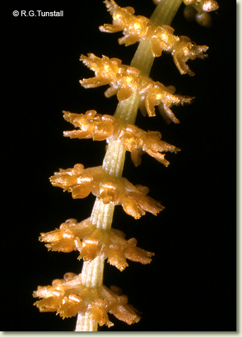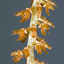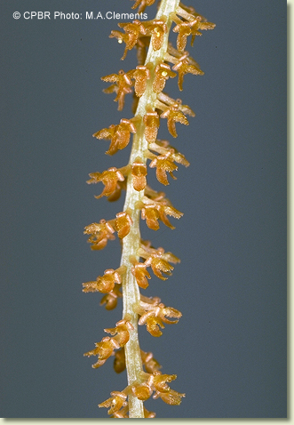 Epiphytic or lithophytic herb forming small erect clumps. Leaves 4-6, scattered along stem, erect, distichous, alternate, sessile, in fan-like array, bases sheathing stem, imbricate; lamina deltate to oblong, falcate, 1.5-2.5 cm x 0.5-0.8 cm wide, fleshy, light green to reddish, apex obtuse. Inflorescence a terminal raceme, arching or pendulous, 30-60 mm long, base with numerous whorled bracts; pedicels 1 mm long, including ovary. Flowers numerous, non-resupinate, porrect, 1.7 mm x 1 mm, orange to orange-brown. Sepals and petals spreading widely. Sepals free, strongly reflexed or recurved, ovate, 0.6 mm x 0.5 mm. Petals ovate, 0.9 mm x 0.5 mm, margins irregularly toothed. Labellum c. 1 mm x 0.6 mm, obscurely 3-lobed; lateral lobes erect; apex of midlobe and lateral lobes entire or toothed. Column erect, 0.4 mm long. Column foot absent. Capsules porrect, dehiscent.