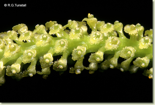Epiphytic or lithophytic herb forming erect to porrect clumps. Leaves 4-6, scattered along stem, erect, distichous, alternate, sessile, in fan-like array, bases sheathing stem and imbricate; lamina ensiform, 5-8 cm x 0.4-0.6 cm wide, green to reddish, fleshy, apex acute. Inflorescence a terminal raceme, arching to pendulous, 50-150 mm long; base with whorls of bristle-like bracts; pedicels 1.5 mm long, including ovary. Flowers numerous, in whorls of 8-10, non-resupinate, porrect, 1.7 mm x 1.5 mm, pale red. Sepals and petals widely spreading or reflexed. Dorsal sepal obliquely erect, elliptic to obovate, 0.7 mm x 0.5 mm, apex obtuse. Lateral sepals free, reflexed against ovary, ovate, 0.7 mm x 0.6 mm. Petals obliquely erect, elliptic to obovate, 0.7 mm x 0.5 mm. Labellum 0.8 mm x 0.9 mm, 3-lobed; lateral lobes spreading, broadly obcuneate, entire; midlobe broad, entire or slightly irregular with crater-like pit. Column porrect from end of ovary, 0.4 mm long. Column foot absent. Capsule porrect, dehiscent.