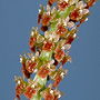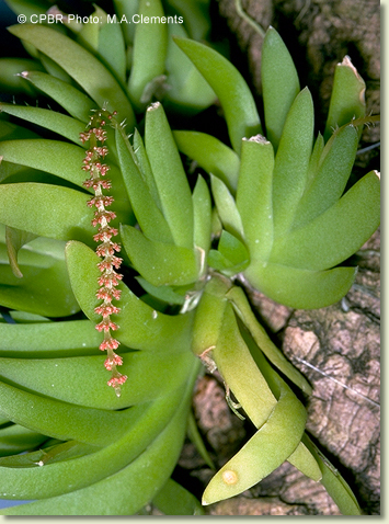 Epiphytic or lithophytic herb forming large, erect to porrect clumps. Leaves 4-6, scattered along stem, erect, distichous, alternate, sessile, in fan-like array, bases sheathing stem, imbricate; lamina broadly ensiform, falcate, 8-15 cm x 1.5-2 cm, bright green to yellowish green, fleshy, apex acute. Inflorescence a terminal raceme, arching, 100-200 mm long, base with few small bracts; pedicels 2.5 mm long, including ovary. Flowers numerous, in whorls of 6-8, non-resupinate, porrect, 2.3 mm x 1.5 mm, whitish to yellowish. Sepals and petals usually reflexed against the ovary. Dorsal sepal ovate to deltate, 1.2 mm x 1 mm, apex obtuse. Lateral sepal free, ovate, 1.2 mm x 0.8 mm, irregular, apex apiculate. Petals ovate to lanceolate, 1.2 mm x 0.5 mm, margins irregularly toothed. Labellum broadly triangular, 1.3 mm x 1.5 mm, obscurely 3-lobed, margins densely fringed, apex emarginate. Column porrect from end of ovary, 0.7 mm long. Column foot absent. Capsules porrect, dehiscent.
