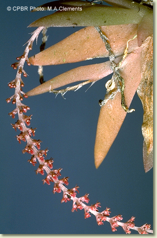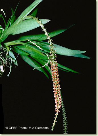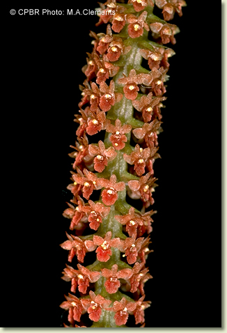 Oberonia rimachila D.L.Jones & M.A.Clem., Austral. Orchid. Res. 5: 11, f.1.13, 1.14, t. 1c,d (21 Dec. 2006). Type: Queensland. Cook District: Tozer Range, ½ mile east of Mt Tozer, 1 July 1948, Brass 19394 (holo CANB 186351; iso BRI 80746).