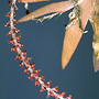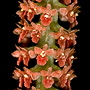 Epiphytic or lithophytic herb forming erect clumps. Leaves 5-7, scattered along stem, erect, distichous, alternate, sessile, in fan-like array, bases sheathing stem and imbricate; lamina ensiform, falcate, 5-7 cm x 0.5-0.8 cm wide, green to reddish, fleshy, apex apiculate. Inflorescence a terminal raceme, arching to pendulous, 50-140 mm long, with whorls of bristle-like bracts at base; pedicels 2.5 mm long, including ovary. Flowers numerous, in whorls of 8-10, non-resupinate, porrect, 1.6 mm x 1.4 mm, translucent to pinkish with red labellum. Sepals and petals spreading or reflexed. Dorsal sepal obliquely erect, elliptic to ovate, 0.8 mm x 0.6 mm, apex obtuse. Lateral sepals reflexed against ovary, ovate, 0.8 mm x 0.6 mm, apex apiculate. Petals appressed to dorsal sepal, 0.8 mm x 0.5 mm, margins irregular. Labellum 1 mm x 1 mm, 3-lobed; lateral lobes spreading, entire; midlobe broad, entire or slightly irregular with narrow slit-like pit. Column porrect from end of ovary, 0.5 mm long. Column foot absent. Capsule porrect, dehiscent.