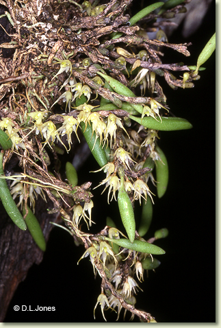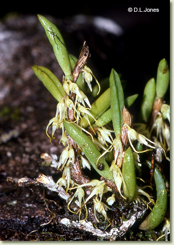 Epiphytic herb forming sparse clumps. Stems few, sparsely branched, erect to pendulous, 10-30 cm long, sheathed in brown bracts. Roots from basal nodes and stem branches, wiry. Pseudobulbs appressed to stem, obovate to cylindrical, 0.5-0.8 cm x 0.4-0.5 cm wide, partly covered by bracts. Leaf solitary on pseudobulb, erect, apical, sessile; lamina narrowly elliptic to oblong, 1.2-3 cm x 0.4-0.6 cm wide, dark green, thick, fleshy, broadly and deeply grooved, apex acute. Inflorescence axillary, single-flowered, erect, solitary or in pairs, 4-6 mm long, from perennial meristem at base of pseudobulb. Flowers solitary, resupinate, erect to nodding, star-shaped, 10-13 mm x 12-15 mm, cream to greenish cream. Sepals and petals fleshy; sepal apices long, filiform. Dorsal sepal narrowly triangular, 9-12 mm x 3.5-4.5 mm. Lateral sepals narrowly triangular, 9-12 mm x 3.5-4.5 mm, inner margins basally fused, bases fused to column foot. Petals obovate, 2-3 mm x 1.5 mm. Labellum unlobed, fleshy, 2-2.5 mm x 1.6-2 mm, curved in semi-circle. Column 1-1.2 mm long. Column foot 1.5-1.8 mm long, curved in a semi-circle. Capsules unknown.