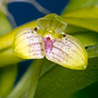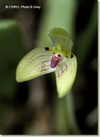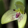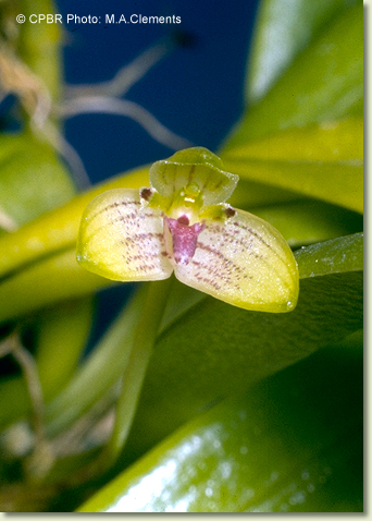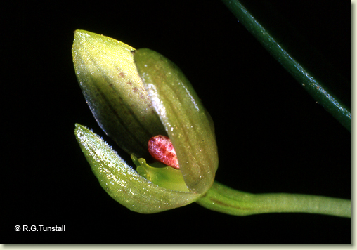 Epiphytic or lithophytic herb forming compact clumps. Pseudobulbs crowded, appressed to host, erect, ovoid to flask-shaped, 1.2-2 cm x 0.7-0.9 cm wide, dark green with narrow extended neck. Leaf solitary on pseudobulb, erect, apical, petiole 2-3 cm long, base not sheathing pseudobulb; lamina ovate to obovate, 7-13 cm x 1.5-2 cm wide, dark green, fleshy, shiny, apex obtuse to apiculate. Inflorescence axillary, single-flowered, 50-70 mm long, from the base of the pseudobulb; pedicel filiform, curved sharply near apex. Flowers solitary, resupinate, nodding, 8-10 mm x 10-12 mm, cream or pale green with red spots and pink to red labellum. Sepals and petals not spreading widely. Dorsal sepal hooded, ovate to oblong, 6-8 mm x 3-4 mm. Lateral sepals ovate, 8-10 mm x 4-5 mm, with irregular lines of red spots, bases fused to column foot. Petals minute, oblong, 2 mm x 0.8 mm, with distinct purple apical spot. Labellum hinged to column foot by small claw, oblong, 3 mm x 1.5 mm, obscurely 3-lobed; midlobe shallowly curved, fleshy, base deeply grooved. Column porrect, 2.5 mm long. Column foot 1.5 mm long, at right-angles to the column. Capsules dehiscent.