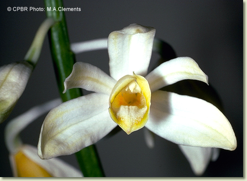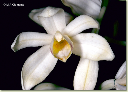 Terrestrial herb forming large clumps. Stems 3-4, crowded, cylindrical to angular, 40-80 cm x 1.5-2 cm, slender, fleshy. Leaves 3-8, scattered along stem, erect, whorled, petioles to 15 mm long, bases sheathing stem; lamina lanceolate, 40-80 cm x 7-14 cm, dark green, pleated, thin-textured, apex acute to acuminate. Inflorescence an axillary raceme, 300-900 mm long, from lower nodes on stem, tough. Flowers 5-20, resupinate, porrect to nodding, star-shaped, 40-70 mm x 42-75 mm, white with yellow labellum. Dorsal sepal obliquely erect, narrowly elliptic to oblong, 30-35 mm x 7-8 mm. Lateral sepals free, divergent, 30-35 mm x 8-10 mm. Petals widely spreading, recurved, 30-35 mm x 6-8 mm. Labellum 25-30 mm x 20-25 mm, with scattered long white hairs, 3-lobed; basal margins incurved; apical margins undulate. Callus with 2 narrow parallel central plates ending in series of overlapping blunt structures. Column 20 mm long, moderately dilated towards apex. Column foot absent. Capsules pendulous, dehiscent.
