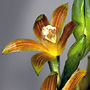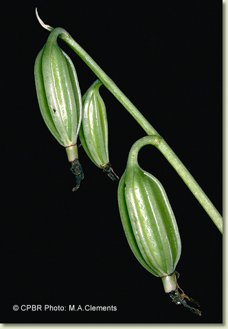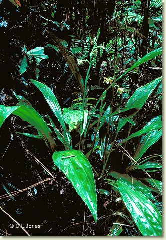 Terrestrial herb forming large clumps. Stems 3-6, erect, cylindrical to angular, 40-60 cm x 1.5-2 cm, fleshy, slightly swollen at the base. Leaves 3-5, erect, apical, petiolate; lamina lanceolate, 40-70 cm x 0.7-0.1 cm, dark green, pleated, thin-textured, apex acute to emarginate. Inflorescence an axillary raceme, 300-900 mm long, tough. Flowers 4-20, resupinate, porrect, star-shaped, 40-50 mm x 40-50 mm, internally brick red with yellow stripes, externally yellow. Sepals and petals spreading widely. Dorsal sepal obliquely erect, oblong to ovate, 35-42 mm x 10-12 mm. Lateral sepals free, divergent, porrect, oblong to ovate, 35-42 mm x 12-14 mm, apex apiculate. Petals widely spreading, recurved, lanceolate, 35-42 mm x 7-9 mm. Labellum unlobed, 15-17 mm x 13-15 mm, yellow inside, with scattered long hairs towards apex; basal margins tubular; apical margins undulate. Callus with 2 narrow parallel plates ending in series of overlapping blunt structures. Column 16 mm long, dilated towards tip, sparsely covered in short hairs. Column foot absent. Capsules pendulous, dehiscent.
