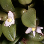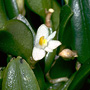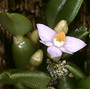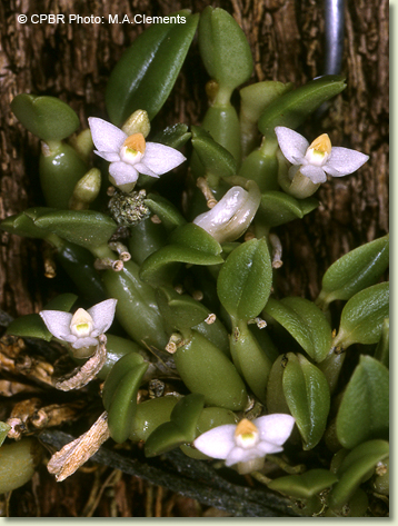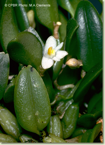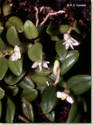Epiphytic or lithophytic herb forming dense mats. Stems creeping, appressed to host, branched, thin, with short internodes. Pseudobulbs crowded, obliquely erect, ovoid or cylindrical, 0.5-1 cm x 0.3-0.35 cm, greyish green, shallowly grooved, shiny, fleshy. Leaf solitary on pseudobulb, erect, apical, shortly petiolate; lamina ovate, 0.8-1.5 cm x 0.4-0.5 cm wide, dark green, fleshy, apex unequally emarginate. Inflorescence single-flowered, arising from meristem at leaf base; pedicels 5 mm long, including ovary. Flowers resupinate, porrect, star-shaped, 4-5 mm x 4-5 mm, white, labellum and column with yellow or orange tip. Sepals and petals spreading widely. Dorsal sepal broadly ovate to oblong, 3 mm x 2 mm, apex obtuse. Lateral sepals oblong, 3 mm x 2 mm, inner margins basally fused, bases fused to column foot, apex obtuse. Petals narrowly oblong, 3 mm x 0.7 mm apex acute. Labellum 5 mm x 1.3 mm, 3-lobed; lateral lobes rudimentary, bases fused to column foot; midlobe thickened, covered in short hairs. Column 1.75 mm long. Column foot 1.5 mm long, in line with column. Capsules nodding, dehiscent.