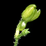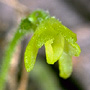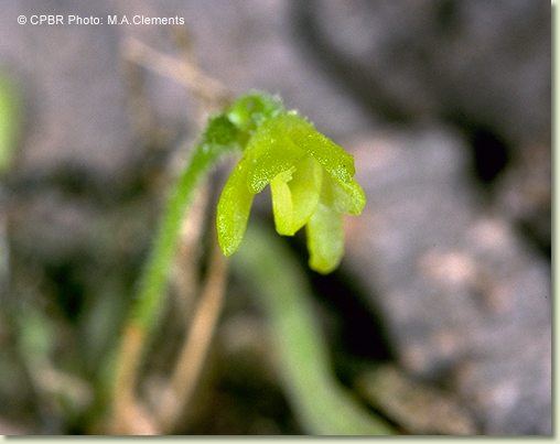 Leafless epiphytic or lithophytic herb forming small clumps. Roots numerous, adherent, 3-8 cm x 0.3-0.5 cm wide, pale green to grey-green, flattened. Stems 0.1 cm long. Leaves absent. Inflorescence an axillary raceme, 5-15 mm long, covered with white hairs; ovaries hairy. Flowers 2, resupinate, erect to porrect, 3 mm x 3 mm, pale yellow to bright yellow, opening one at a time. Sepals and petals free, widely spreading, externally hairy at base. Dorsal sepal 2.5 mm x 1 mm. Lateral sepals 2.5 mm x 1 mm. Petals 2 mm x 1.5 mm. Labellum cymbiform, 1.5-2.5 mm x 1.5 mm, 3-lobed; lateral lobes incurved and meeting; midlobe with small obtuse apical appendage; spur 1 mm long, cylindrical. Column 1 mm long. Capsules porrect, dehiscent.