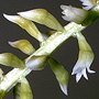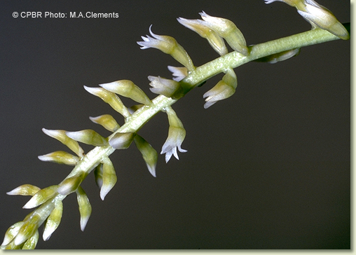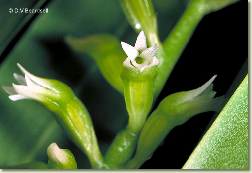 Epiphytic or lithophytic herb forming small clumps. Pseudobulbs absent. Stems erect, in tufts of 2-6, flattened, 2-5 cm wide. Leaves 3-6, scattered along stem, erect to arching, distichous, alternate, sessile, bases sheathing stem; lamina narrowly oblong, 20-30 cm x 2.5-2.8 cm, dark green, thin, ridged beneath, apex unequally emarginate. Inflorescence an axillary raceme, erect to arching, 200-400 mm long, stiff, thin; pedicels 5 mm long, including ovary; ovaries triangular in cross-section. Flowers 6-15, resupinate, erect to porrect, 5-7 mm x 3-4 mm, base tubular, green, upper parts white and spreading. Dorsal sepal porrect, gibbous at base, 4-6 mm x 1-1.5 mm, apex obliquely erect. Lateral sepals free, triangular in cross-section, 4-6 mm x 1-1.5 mm. Petals 3-5 mm x 0.8 mm. Labellum unlobed, decurved, cordate, 4-4.5 mm x 2.5 mm, middle constricted. Column 1-1.5 mm long, apex toothed. Column foot absent. Capsule porrect, dehiscent.