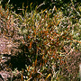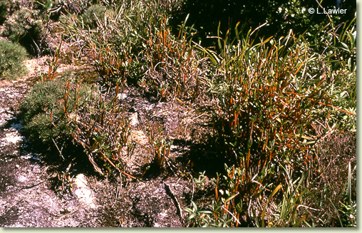 Terrestrial or lithophytic herbs forming large clumps. Pseudobulbs erect, narrowly cylindrical, 2-24 cm x 0.3-0.4 cm, pale green to yellowish to red, thin, shallowly furrowed, with numerous aerial growths. Leaves 1-3, apical, erect to prostrate, distichous, alternate, sessile, bases sheathing pseudobulb; lamina elliptic to lanceolate, 5-8 cm x 1-2 cm, dark green, thin-textured, apex unequally emarginate. Inflorescence a terminal raceme, 30-45 mm long; pedicels 10-14 mm long. Flowers usually 1-2, sometimes up to 5, resupinate, porrect, 27-40 mm x 25-35 mm, cream to white with yellow and purple central markings. Sepals and petals fleshy, widely spreading. Dorsal sepal obliquely erect, ovate to lanceolate, 22-26 mm x 6-8 mm, fused to column foot at base, apex acute to acuminate. Lateral sepals lanceolate, falcate, 24-26 mm x 12-14 mm, apex acute. Petals porrect to spreading, linear, falcate, 20-22 mm x 4-5 mm, apex acute to acuminate. Labellum curved, 14 mm x 13 mm, white with purplish red suffusions and markings, 3-lobed; lateral lobes triangular, erect; midlobe rounded, with single yellow ridge, margins and upper surface with short dense tangled transparent hairs. Column porrect, 4 mm long. Column foot 8 mm long, curved. Capsule porrect to pendulous, dehiscent.