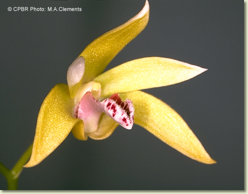 Dendrobium finniganensis D.L.Jones, Phytologia 73(1): 3-6, f.1 (1992). Type: cultivated Australian National Botanic Gardens, 31 Jan. 1992, ex Australia. Queensland: Cook District: Mt Finnigan, L. Roberts s.n. (L. Lawler 66) (holo CANB; iso BRI).