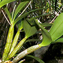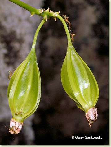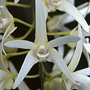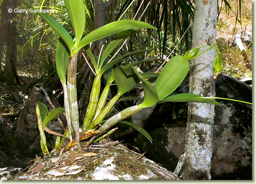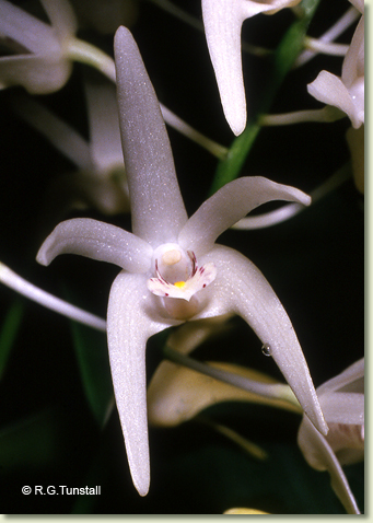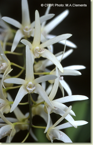 Epiphytic or lithophytic herb forming small to medium-sized clumps. Pseudobulbs erect, fusiform, 20-50 cm x 3-4 cm, dark brownish green, hard, prominently ribbed. Leaves 2-7, erect to prostrate, apical, distichous, alternate, sessile, bases sheathing pseudobulb; lamina ovate, 6-15 cm x 4-6 cm, dark green, thin-textured, leathery, apex unequally acuminate. Inflorescence a terminal raceme, 200-350 mm long. Flowers 10-35, crowded, resupinate, porrect, star-shaped, 16-20 mm x 20-25 mm, cream or white, yellowing with age, fragrant. Sepals and petals widely spreading, narrow, apices apiculate. Dorsal sepal obliquely erect, narrowly triangular, 16-22 mm x 3-4 mm. Lateral sepals divergent, narrowly triangular, falcate, 16-22 mm x 2.5-4.5 mm, bases fused to column foot. Petals decurved, linear, 16-22 mm x 2 mm. Labellum curved, 8 mm x 7 mm, white with purple markings; lateral lobes crescent-shaped; midlobe oblong, with single orange ridge, apex truncate. Column 3-4 mm long. Column foot curved, 4-5 mm long. Capsules pendulous, dehiscent.