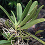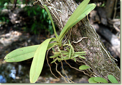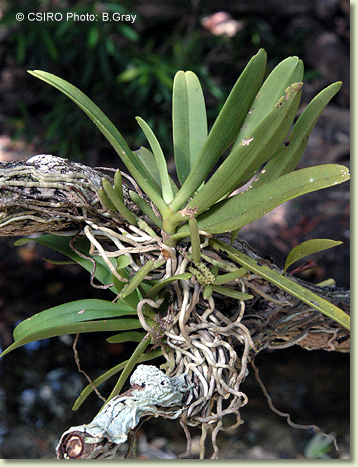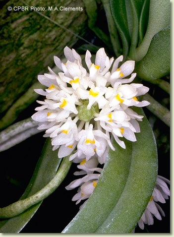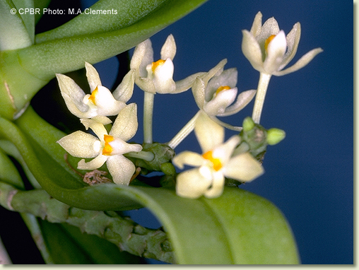 Epiphytic or lithophytic herb forming coarse upright clumps. Roots numerous, adherent, thick, cord-like, 0.3 cm wide, forming buttress supporting stem. Stems erect, 5-10 cm long, sparsely branched, thick. Leaves 4-8, scattered along stem, crowded, erect to prostrate, distichous, alternate, sessile, bases sheathing stem; lamina oblong to lanceolate, 8-14 cm x 2-2.5 cm, pale greyish green to yellow-green, thick, leathery, apex unequally emarginate. Inflorescence an axillary raceme, 20-45 mm long, rachis club-shaped, with sunken areas, bearing up to 15 flowers at once. Flowers numerous, resupinate, erect to porrect, 8-10 mm x 8-10 mm, short-lived, cream with orange and white labellum. Sepals and petals moderately spreading. Dorsal sepal erect, obovate, 7 mm x 2.5 mm, apex recurved. Lateral sepals free, divergent, obovate, 7 mm x 2 mm. Petals 7 mm x 1 mm. Labellum projected forwards, 6 mm x 4 mm, 3-lobed; lateral lobes short, more or less triangular, fleshy, curving outwards; midlobe 1 mm long, with short decurved spur. Column porrect, 2.5 mm long. Column foot absent. Capsules porrect, dehiscent.