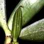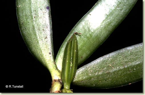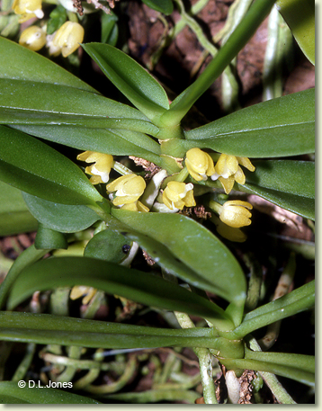 Epiphytic or lithophytic herb forming erect to semi-pendulous clumps. Roots few, cord-like, 0.2 cm wide. Stems erect to pendulous, 3-6 cm long, unbranched. Leaves 3-6, scattered along stem, crowded, prostrate, distichous, alternate, sessile, bases sheathing stem; lamina elliptic to ovate, 5-8 cm x 2 cm, dark green, thick, fleshy, apex unequally emarginate. Inflorescence an axillary raceme, 5-15 mm long, thick, fleshy, not club-shaped, bearing groups of up to 4 flowers at once. Flowers resupinate, erect to porrect, cupped, 2-3 mm x 3-4 mm, dull yellow with white labellum. Sepals and petals moderately spreading. Dorsal sepal hooded, 5 mm x 2.5 mm. Lateral sepals free, oblong, 5 mm x 3 mm. Petals 4 mm x 1 mm. Labellum 4 mm x 5 mm, the walls very thick and fleshy, 3-lobed; lateral lobes short; midlobe short. Spur 1.5 mm long, with narrow, slit-like opening. Column 2 mm long with incurved wings. Column foot absent. Capsules porrect, 10 mm long.