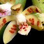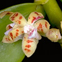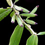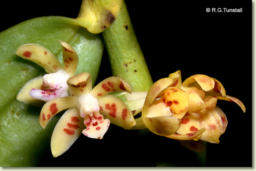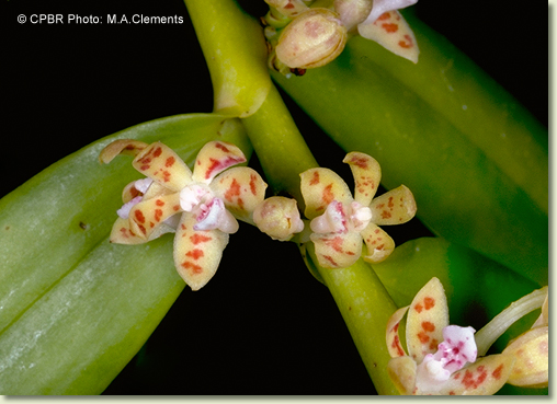 Epiphytic or lithophytic herb forming coarse straggling clumps. Plants often consisting of a single erect to semi-pendulous growth. Roots thick, cord-like. Stems erect to pendulous, 10-50 cm long, thick, flattened, sparsely branched from the base. Leaves scattered along stem, erect to pendulous, often drooping, distichous, alternate, sessile, bases sheathing stem; lamina lanceolate, 7-12 cm x 2-2.5 cm, dark green to yellowish green, thick, leathery, glossy, apex unequally emarginate. Inflorescence an axillary raceme, emerging opposite a leaf; peduncle very short; pedicels 5-10 mm long. Flowers 2-6, in tight clusters, resupinate, erect to porrect, 10-12 mm x 10-12 mm, creamy yellow with red-brown blotches. Sepals and petals widely spreading, thin-textured. Dorsal sepal erect, oblong, 6.5 mm x 2 mm, apex incurved, obtuse. Lateral sepals free, oblong, 7 mm x 3 mm, with rounded basal lobe, bases fused to column foot. Petals spathulate, 6 mm x 2 mm. Labellum projected forwards, 5 mm x 2.5 mm, 3-lobed; lateral lobes erect, fleshy, joined to column base; midlobe 2.5 mm long, fleshy, hairy, with spur 1.5 mm long. Column 3 mm long. Column foot absent. Capsules porrect, dehiscent.