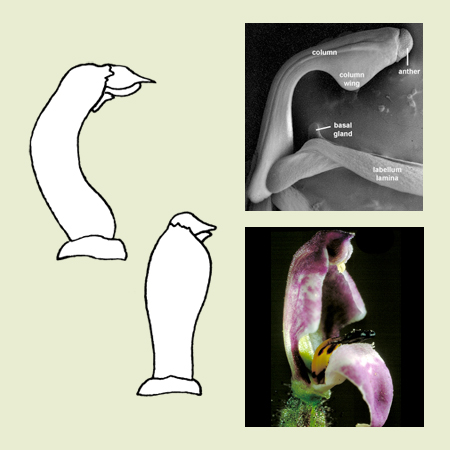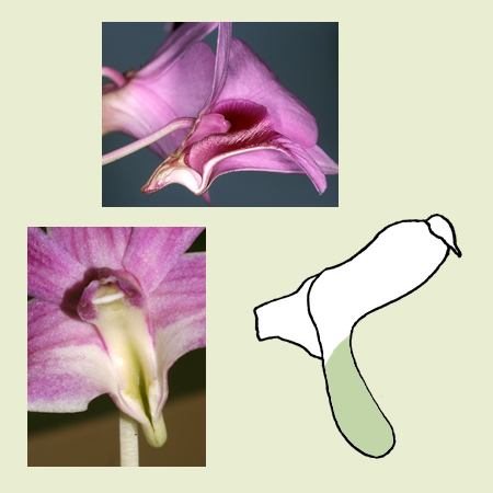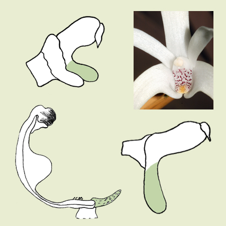 In some orchids the column has a basal extension known as the column foot. It can continue in the same line as the column, be projected at right angles to the column and be straight or curved. The column foot in most species is moderately short but it can be long and prominent or very short. In Vappodes the column foot has two prominent basal swellings separated by a deep central groove.