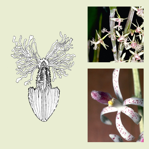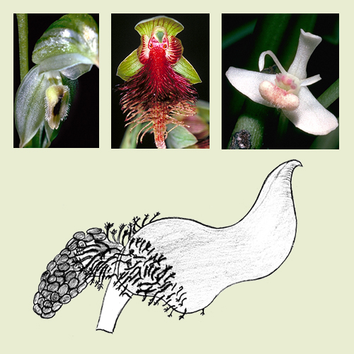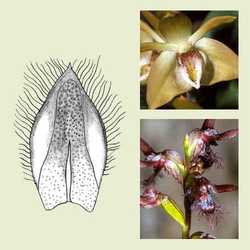 Many species of orchids have hairs on the labellum. These can be simple structures or with the apex swollen into a gland. They are often a prominent feature in flowers that are pollinated by small flies.