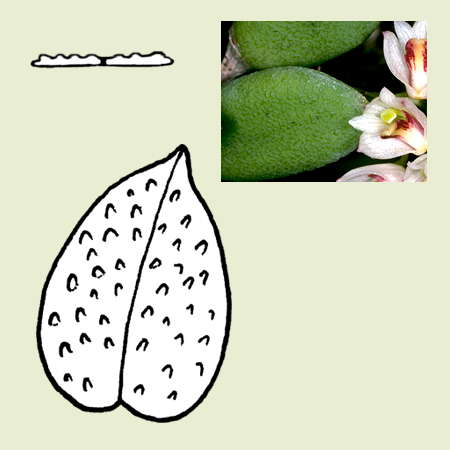 Warty: the leaf surface has irregular lumps resembling warts (verrucose). |