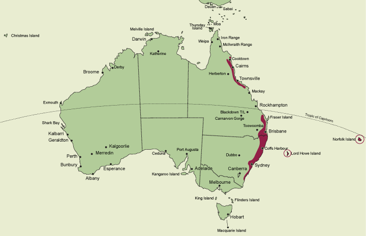 A genus of about 9 species, the majority occurring in eastern Australia with a single species in New Zealand and another in New Caledonia. The Australian species are distributed between the McIlwraith Range (13°46' S) on Cape York Peninsula, Queensland, and Mumbulla Mountain near Bega, (36°40' S), New South Wales. State occurrence: Queensland, New South Wales (including Norfolk and Lord Howe Islands).