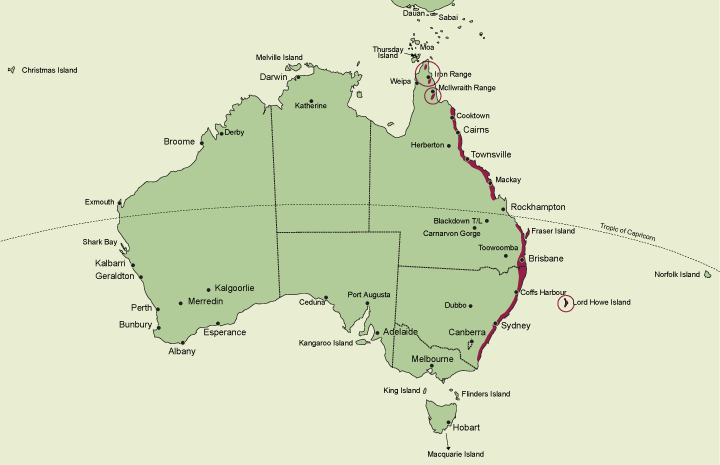 A genus of about 150 species distributed in Africa, India, South-east Asia, Malaysia, Philippines, Indonesia, New Guinea, New Caledonia, Polynesia and Australia where there is a single endemic species, Calanthe australasica, distributed between the Iron Range on Cape York Peninsula in northeastern Queensland and Termeil in southern New South Wales. State occurrence: Queensland, New South Wales (including Lord Howe Island).