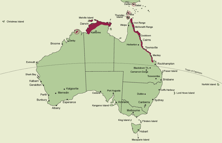 A genus of about 80 species widely distributed in tropical areas of Africa, Madagascar, Asia, South-east Asia, Malaysia, Philippines, Indonesia, New Guinea and Australia where there are 6 species in the tropical north, 2 or 3 endemic. State occurrence: Queensland (including Moa, Saibai and Thursday Islands), Northern Territory, Western Australia.