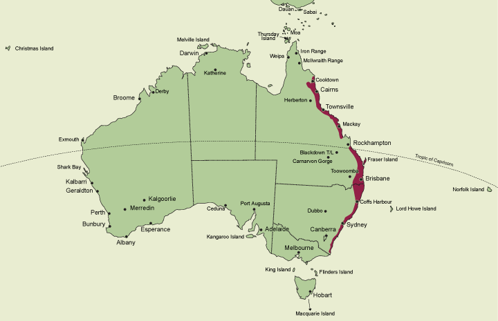 A genus of about 25 species, a significant number occurring in New Guinea, with 8-9 species endemic in Australia. The genus is also distributed in Thailand, Burma, Laos, Vietnam, Malaysia, Philippines, Borneo, Indonesia and Fiji. State occurrence: Queensland, New South Wales.