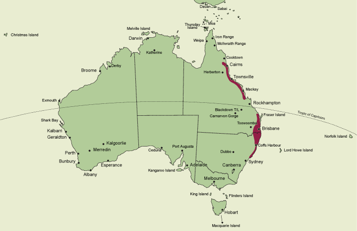 A monospecific genus with the single species, Rhinerrhiza divitiflora, endemic in eastern Australia and distributed between the Atherton Tableland (about 17º16' S) and the Hunter River (about 32º56' S) in northern New South Wales. In temperate and subtropical regions the plants are mainly found at low to moderate altitudes but in the tropics they are restricted to moderate or high altitudes in the ranges and tablelands. State occurrence: Queensland, New South Wales.