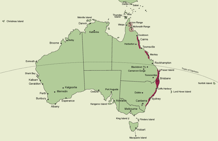 A genus of 4 species endemic in Australia between the Iron Range (12°38’S) on Cape York Peninsula in northeastern Queensland and near Tomerong (35º03'S) in southern New South Wales. State occurrence: Queensland, New South Wales.