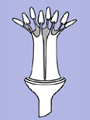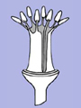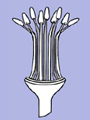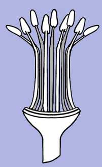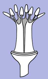 Stamens fused into a tube split along one sideThe staminal filaments are fused to each other forming a tube that is split (usually to the base) along one side. |
