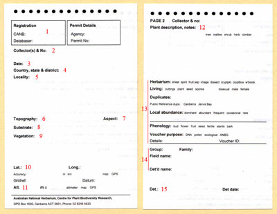The space after the heading CANB is for the registration number of the specimen. This number is not to be entered in the book during the field trip, but will be added later when the field book is registered.