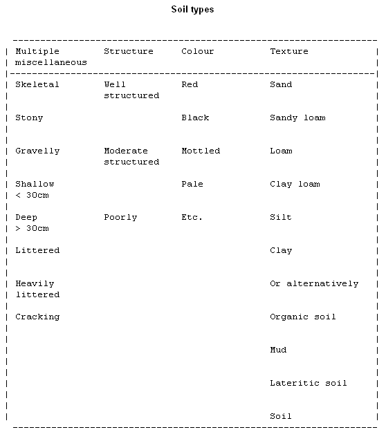 - Physiography (topographic position) e.g. mountain top, sea shore, lake, sand dune, alluvial plain.