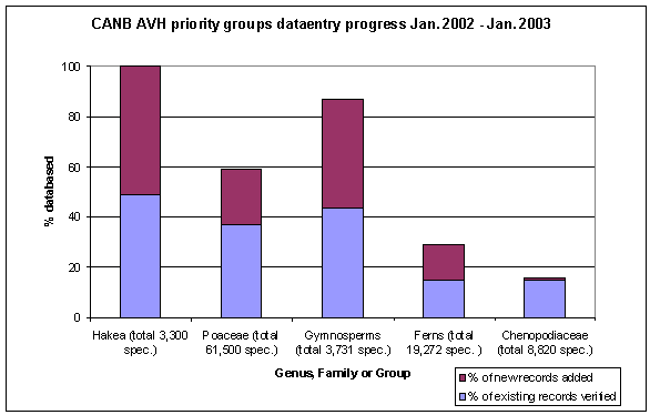 The AVH team is now complete with the commencement of the last two dataentry staff, James Hill and Osvaldo Gonzalez, who are both working on the ANBG site. The AVH team consists of 14 dataentry staff, 2 identifiers, and various other support staff. Most dataentry staff are working part time in morning or afternoon shifts. Work on the CSIRO site has included Hakea and Poaceae, and is now focused on the chenopods, while work on the ANBG site has focused on the Gymnosperms and the Ferns.