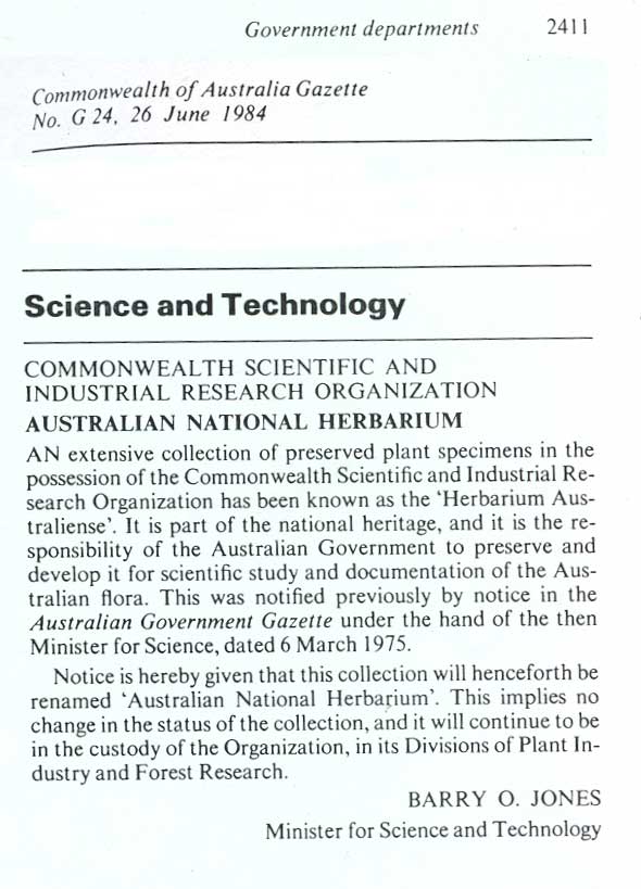 Gazettal of 'Herbarium Australiense' as an institution - to house collections of "plants of Australia and adjacent territories" (25/3/75) |