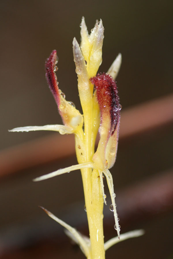 Surveys for each orchid species continued throughout the year with the aim to identify plants requiring translocation. During these surveys of the site, flowers of both Cryptostylis hunteriana and Corybas dowlingii were hand pollinated, from which seed was collected for germination trials and stored for later use. In addition, seeds of Rhizanthella slateri were collected for germination trials and storage. All Cryptostylis hunteriana plants that will be affected were located and marked. Surveys of new colonies of Corybas dowlingii found late in the growing season will continue into the growing season of 2009.