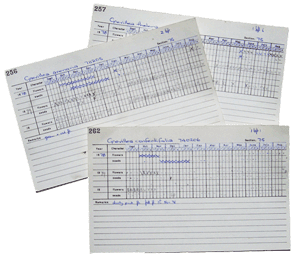 Data were recorded initially on 20 x 12.5 cm cards. Typically, the taxon name, ANBG Property ID, and planting Section were recorded on the top of each card. Many of the Property ID records have subsequently been linked, using the ANBG Integrated Biodiversity Information System (IBIS), to voucher specimens in the Australian National Herbarium.