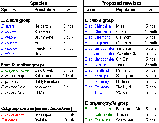 The study was based mainly on seed lots collected by Tony Bean and Maurice McDonald. It focused on the phylogeny of 13 taxa in the E. crebra group, which included nine proposed new taxa. Four taxa from the E. drepanophylla group (with three proposed new taxa), the E. siderophloia group (one taxon), the E.granitica group (one taxon) and the E. fibrosa group (one taxon) were also represented. Eucalyptus sideroxylon and E. tricarpa were included as outgroup species from the series Melliodorae. (See Table 1)