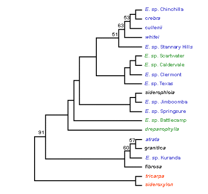 A major finding of the study was support for the concept that E. crebra and E. drepanophylla have geographically restricted occurrences and that populations formerly assigned to these species represent new taxa identified by Tony Bean. The typology of proposed new taxa in both trees indicates they are genetically distinct. However, Siderophloiae taxa were characterised by high levels of allozyme variation and relatively similar allelic frequencies. This is reflected in the lack of bootstrap support for the clustering of most taxa in both trees. While the taxonomic recognition of proposed new taxa is supported, Beans informal grouping of taxa based on morphological attributes (shown in Table 1) was poorly resolved.