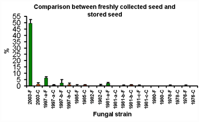 For this experiment, the variable was seed, with seeds stored for different amounts of time being used. The seed was originally collected in: 1997 (stored at room temperature), 1985, 1982, 1981, 1980, 1978 and 1976.