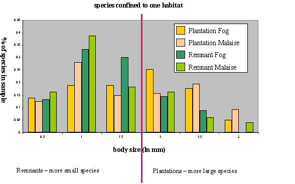 Remnant and plantation data was pooled from the 4 geographically separated sites to create one large sample in which the body size distributions of the beetle assemblages from the two habitats could be compared.