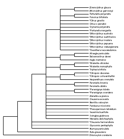 Australia is the fourth largest citrus producing country in the Southern Hemisphere, with the citrus industry having an estimated gross production value of around $4.3 million (Anon, 2004). Wild members of Australasian Citreae are anticipated to possess genes which provide a number of beneficial traits for growth in the Australian environment and therefore it is predicted they will be useful in citrus breeding programs. Breeding programs are already investigating native members resistance to salt, boron and the cold but the breeding of new, high quality Citrus cultivars for the Australian environment is dependent on reliable information about the relationships of species in genera within the tribe Citreae (Birmingham, 1998).