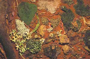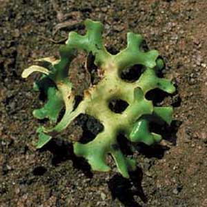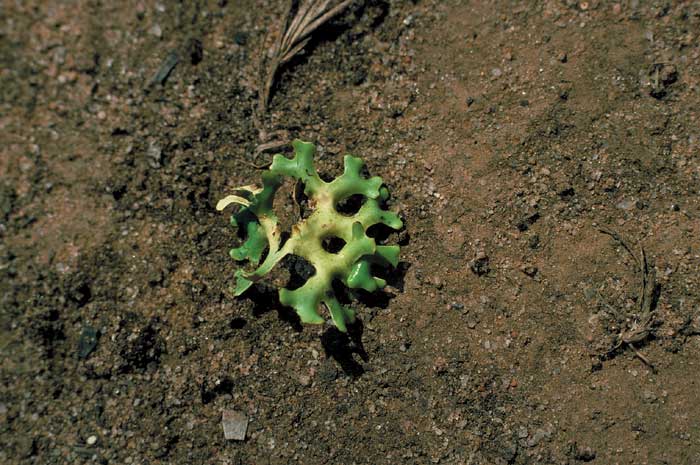 | Chondropsis semiviridis, a foliose lichen found on the ground in drier areas, is unusual in that it is not attached to the soil, but free. When it is dry it curls up, when wet it flattens out. | |