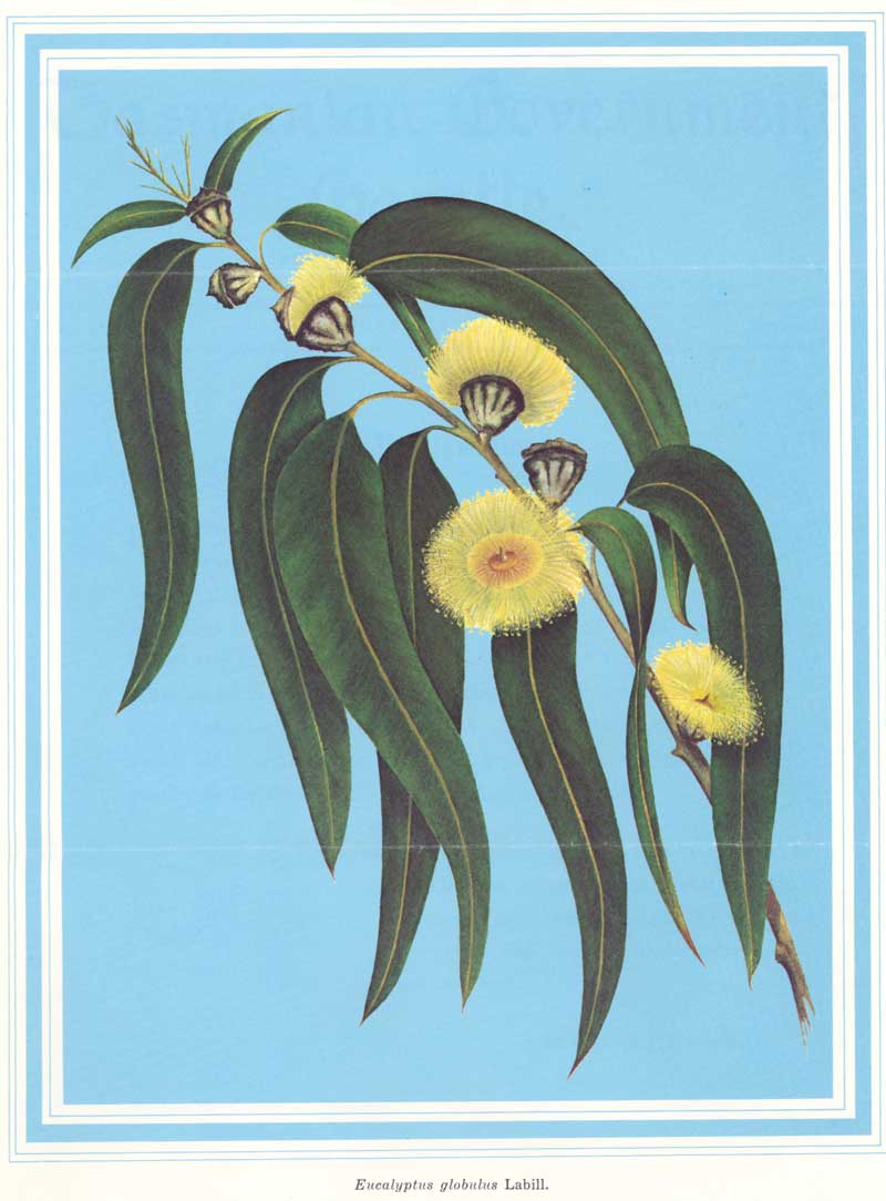 Eucalyptus globulus was first collected on the south-east coast of Tasmania in 1792-93 by Jacques-Julien Houtou de Labillardiere (1755-1834) and described by him in 1799. He was a distinguished French botanist who accompanied Bruny D'Entrecasteaux on the expedition in La Recherche and L'Esperance in 1791-94 in search of their missing compatriot, La Perouse. The two ships of the expedition led by La Perouse landed at Botany Bay on 26 January 1788. They departed six weeks later and forty years elapsed before their fate was established by the discovery of wreckage at Santa Cruz, north of the New Hebrides. Labillardiere was a keen collector of plants and animals and also recorded detailed accounts of the appearance and customs of the Australian Aboriginals he observed. His plant specimens are now housed in the Museum of Florence.