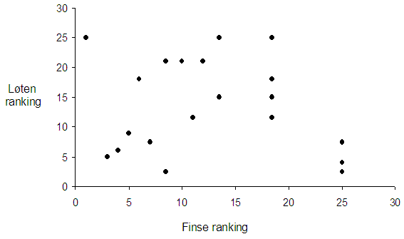 Case StudiesWooden fencesWooden fences were once common in Scandinavia since both labour and raw materials were abundant and cheap. Such fences, now rarer, were made of hard, thin boards, typically of spruce or pine and an important characteristic of such fences is that the thin boards would dry out quite quickly once the rain stopped. The fluctuating water levels, the exposure to cold in winter and considerable drying out in summer combined to make such a thin-board fence a challenging place for mycelial colonization. Moreover, the thin boards provided a rather small volume of wood for fungal attack. All in all such fences presented a distinct ecological niche for wood-rotting fungi so the authors of the paper listed below thought it worthwhile to analyse the fence-inhabiting fungi while there were still fences around for analysis. Their investigation was confined to the wood-inhabiting corticioid and polypore fungi. The great majority of the species found were corticioid fungi, which have flattish, sheet-like fruiting bodies. The study sites were at Løten and Finse in Norway. Løten is in the south-western lowlands, 250 metres above sea level, with coniferous forests as the dominant vegetation type. Finse is in the south-central alps, at an altitude of 1220 metres with alpine meadows the dominant vegetation type. Løten is typically continental (dry, cold winters and dry, warm summers; average annual rainfall is 535 millimetres) while Finse has a humid, cold and oceanic climate with an average annual rainfall of 1050 millimetres. The average January temperature at both sites is -10 degrees Celsius but the average July temperatures are 7 degrees (Finse) and 14 degrees (Løten). Over the 1981-1982 period over 300 specimens were collected from each site but far fewer species were found at Finsen (42) than at Løten (82), with 27 species common to the two sites. Corticioid fungi were far more common than the polypores. Four polypore specimens (representing three species) were collected at Finse, while 25 polypores (from 10 species) were found at Løten. Presumably the polypores are generally poor colonizers of thin, exposed wood. Given their very rare appearances they will feature no more on this web page so that all the species mentioned from now on will be corticioid fungi. Hyphodontia subalutacea was the most common species at Finse, accounting for 73 of the 325 specimens collected there. Then followed Amyloathelia crassiuscula (30), Botryobasidium obtusisporum (30), Botryobasidium subcoronatum (29) and Jaapia argillacea (19). At Løten the top five were Amyloathelia crassiuscula (39 of 377 collections), Phlebia cretacea (31), Xenasmatella filicina (26), Hypochniciellum molle (15) and Hyphodontia breviseta (15). What if you start looking at numbers of specimens and species in percentage terms? At Finse there were 42 species, so a single species equates to 2.3% of the total number of species. Of the 325 specimens collected there, 73 equates to about 22% of the total specimens. Put this way you could say that the most abundant 2.3% of species accounted for 22% of the specimens. At Løten, with 82 species in total, 2 species equate to 2.4% of the 82. Now, look at the two most abundant species at Løten, which were listed in the previous paragraph. Together those 2.4% of species accounted for 70 collections, or about 19% of all the specimens collected at Løten. In percentage terms the results for the two sites are very similar. Continuing this exercise for all the species and specimens at each site gives the following graphs. The sold black line gives the information for Finse and the broken red line for Løten. Here are two more specific examples to help you understand the graphs. Look at the sold, vertical blue line which is positioned at the 10% point on the horizontal axis. You can see that the most abundant 10% of species at Finse accounted for about 50% of the specimens collected there and the most abundant 10% of species at Løten accounted for about 45% of the specimens there. If you look at the broken, vertical blue line you can see that the most abundant 20% of species at Finse accounted for about 70% of the specimens and that the corresponding figure for Løten is about 60%. At Løten there were relatively more species with just a few specimens per species than there were at Finse, so the Løten line approaches the final 100% mark more slowly than does the Finse line. In the natural world it is often the case that a small proportion of species accounts for a disproportionately large proportion of sightings or occurrences. For example, each year about 40 bird species appear in my garden, resulting in several thousand individual visits. Probably fewer than 10 of those species would account for about 80% of all bird visits. Of the species common to both sites Amyloathelia crassiuscula is unusual in that there were roughly equal numbers and percentages of specimens of this species from both sites, 39 from Løten (a little over 10% of all specimens) and 30 from Finse (a little over 9% of specimens). Generally the rankings of the common species were markedly different at the two sites. For example, while Hyphodontia subalutacea was the most abundant species at Finse it was found only once at Løten and Botryobasidium obtusisporum, the second ranking species at Finse was not found at Løten. Similarly no collections of either Phlebia cretacea or Xenasmatella filicina were found at Finse, but those species were the 2nd and 3rd most abundant species at Løten. The following scatter plot shows the Finse and Løten rankings for each of the 27 species common to the two sites. The horizontal axis shows the Finse rankings and the vertical axis those at Løten. A more abundant species has a smaller ranking number than a less abundant species. This reflects ordinary English usage in which, for example, something of the first rank is better than something of the second rank. In the scatter plot