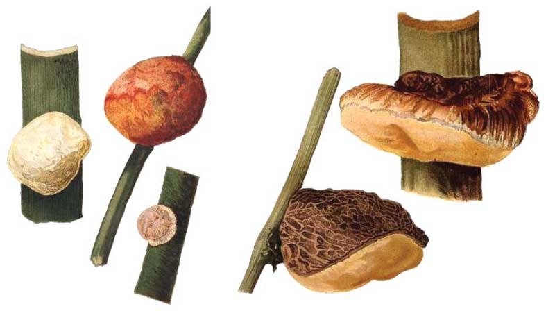 Case StudiesMonkey foodAt least 22 primate species have been seen to eat fungi. Included in these 22 are gorillas, bonobos, macaques, vervet monkeys, mangabeys, colobines, marmosets and lemurs. However the question of fungus consumption by primates has been little studied, with most reports being anecdotal. Also poorly known is which fungi the primates eat, few fruiting bodies having been identified beyond descriptive term's such as "bracket fungus" or "mushroom". The available evidence suggests that, in general primates spend little time searching for fungi, with less than 5% of feeding time devoted to fungus eating, or mycophagy. However, there are exceptions and one of these is Goeldi's monkey (Callimico goeldii), a small monkey of the Amazon basin. An adult weighs about half a kilogram. Goeldi's monkeys eat the fruiting bodies (or sporocarps) of four fungi on a regular basis, the four species being Auricularia auricula, Auricularia mesenterica, Ascopolyporus polychrous and Ascopolyporus polyporoides. Auricularia sporocarps are rubbery, typically somewhat ear-shaped when fresh and the genus is found worldwide. Some species of this genus are commercially grown for human consumption in various Asian countries. The genus Ascopolyporus is found in Central and South America and the sporocarps are bulbous to hoof-shaped, giving a superficial resemblance to various polypores and hence the explanation for the latter part of the genus name. However, they are ascomycetes of the broad "flask fungi" group, the asci being produced in miniature chambers (or perithecia) on the sporocarps' lower surfaces. There's a little more about the genus Ascopolyporus further on. When compared to other foods the fungal sporocarps appear sporadically and with a patchy distribution, so the monkeys must travel widely in search of sporocarps. It is also possible that fungi would be low in accessible nutrients. There have been few studies on the physiology of primate mycophagy, but investigations on other animals have shown that sporocarps are difficult to digest and that animals without foregut fermentation systems would extract at most little protein and energy from the sporocarps. Goeldi's monkeys lack foregut fermentation so why do these monkeys seek out fungi? One possibility is that fungi provide important vitamins or minerals. The monkeys eat fungi year round but fungi are eaten much more during the early part of the dry season when fruit is rarer. Over a whole year Goeldi's monkeys spend about 29% of their feeding time eating fungi but during the dry season up to 63% of the feeding time can be spent on mycophagy. The fungi therefore appear to be a fall-back food, though it is clear that the monkeys do deliberately seek out the fungi, rather than just eating them as they come across them by chance. Still, why not spend more time looking for the scarce fruit during the early part of the dry season? There is considerable competition for fruit (especially during the dry season) and Goeldi's monkeys typically lose out to other monkeys in aggressive encounters. The fungi eaten by Goeldi's monkeys are much more abundant in the forest understorey than in the middle levels and forest canopies, where the other monkeys spend most of their time. Zoologists studying Goeldi's monkeys have reported seeing no competitions with other monkeys for fungal sporocarps, so the heavy reliance on fungi by Goeldi's monkeys would reduce feeding competition. The researchers suggested that reliance on low-nutrient fungi would help explain the fact that Goeldi's monkeys have a lower population density and much larger home ranges than those of other, similar-sized monkeys in the same forest. It has also been suggested that Goeldi's monkeys may have some other adaptation, yet unknown, to help them digest fungal sporocarps so further studies of this monkey would be very worthwhile. In the USA annual mushroom consumption averages out at about 1.9 kilograms (fresh weight) per person, while for Goeldi's monkeys the average annual fungal consumption is about 6.1 kilograms (fresh weight) per monkey. AscopolyporusThe following illustrations are from Alfred Möller's Phycomyceten und Ascomyceten. Untersuchungen aus Brasilien, published in 1901 by Verlag von Gustav Fischer in Jena. It was in that book that Möller gave the first description of the genus Ascopolyporus and of the species Ascopolyporus polychrous and Ascopolyporus polyporoides. He noted that the sporocarps are fleshy or gelatinous, are found on various bamboos and can grow to four centimetres in diameter (Ascopolyporus polychrous) or seven centimetres (Ascopolyporus polyporoides). In the image, the trio on the left belong to polychrous and the pair on the right to polyporoides. Going from left to right the diameters of the sporocarps featured here were 30, 35, 15, 60 and 60 millimetres. Möller noted that the sporocarps of Ascopolyporus polychrous had a weakly sweetish taste. Möller recorded the following observations about the growth of seven Ascopolyporus polychrous sporocarps. The measurements given are diameters and a bold X indicates that on the given date the sporocarp was missing. Notes: