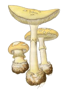 Despite the variation in the regulations that did exist there was a fair degree of overlap between many of them. Inspection by officially appointed inspectors was a common requirement along with a stipulation that any dangerous or dubious fungi were to be seized and destroyed. Fungi could be dubious for various reasons and even edible species could sometimes be rejected. The regulation in force in Graz, Austria, at the end of the 19th century noted that the outward appearance of certain edible species could vary depending on where they came from. If there were the slightest doubt about any fungi they would be rejected. Various places prohibited the sale of edible species if they were in poor condition - for example too old. As they age many macrofungi readily become hosts to moulds and bacteria and in such a state even edible species pose a threat to health. In Graz it was ruled that if, in a batch of fungi, a significant proportion was found to be in a state of decay the whole batch would be destroyed. The regulations commonly specified that only whole fungi were allowed to be sold. Some fungi are hard to identify if they are missing bits. For example a cup-like base, or volva, is commonly found around the stems of many species in the genus Amanita, a genus that includes several deadly species. The accompanying painting of the deadly Amanita citrina is taken from Champignons mortels et dangereux, a small guide book published in Paris in 1911. It was written and illustrated by Fernand Guéguen who had trained as a pharmacist. The painting shows three mushrooms with volvas around their bases. A volva carries a significant amount of information for seeing a volva immediately alerts you to the strong likelihood that you have an Amanita before you. Features such as surface scales on some mushroom caps or the short "skirts" found around the upper stems of some species (such as the Amanita shown here) are also very helpful in identification but can be removed by rough handling. All these points will help you understand why, for example, the regulation brought into force in 1905 by the French town of Mâcon included this condition: